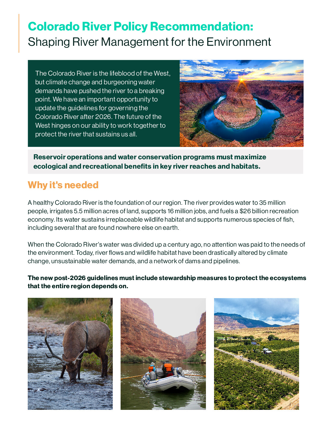 The people of the West are bound together by the Colorado River – whether we’re fly fishing in the Rocky Mountains, rafting the Grand Canyon, or turning on the tap in Las Vegas. Our entire region must work together to protect the river we all depend on. The Cooperative Conservation Alternative provides a roadmap for doing just that.