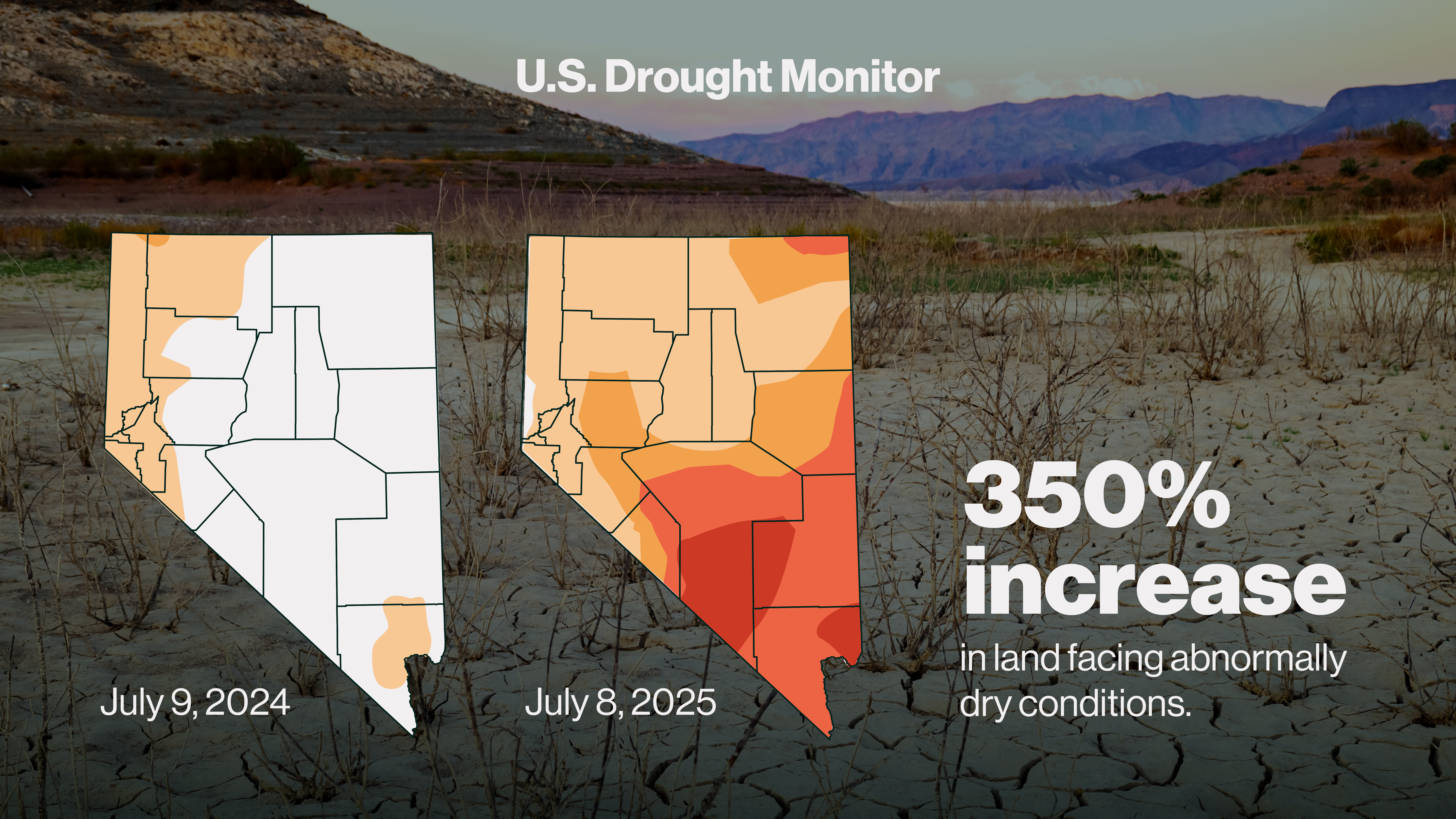 Heat strains already scarce water resources, pushing Nevada’s arid landscapes into further distress. In 2024, Las Vegas experienced no measurable rain for 214 consecutive days. This was the second time in 88 years that the city saw no rain for more than 200 days. And beloved wildlife suffers alongside human populations. In June, the Nevada Department of Wildlife captured, airlifted, and relocated 139 Desert Bighorn Sheep, the Nevada state animal, as expanding drought conditions diminished the herd’s food and water supply to critical levels. This is part of an ongoing and unsettling trend. From July 2024 to July 2025, the state saw a 350% increase in land facing abnormally dry conditions, according to the U.S. Drought Monitor. That means 99.63% of Nevada’s land is experiencing some form of drought, an area that’s home to an estimated two million residents.