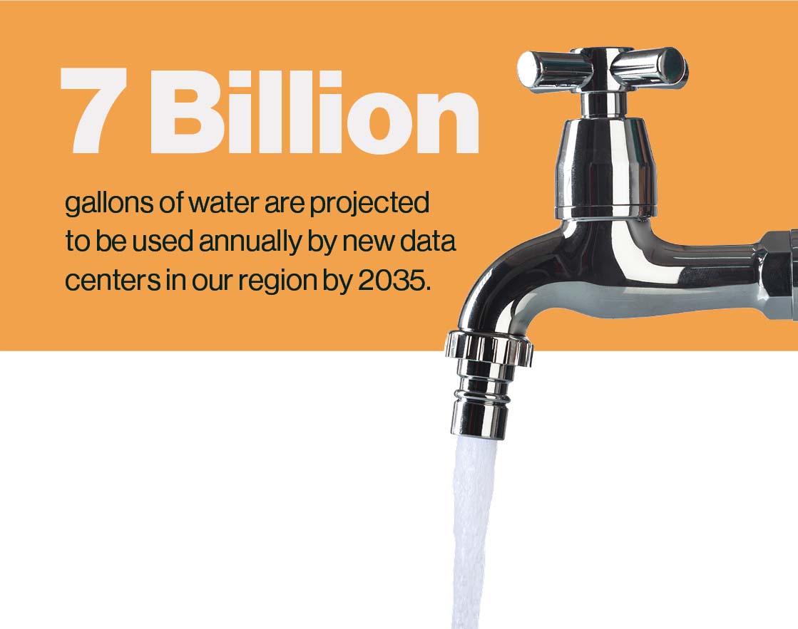 Imagine a warehouse the size of a football field, filled not with goods — but with rows and rows of computer servers. These energy-hungry data centers are expected to drive a more than 50% increase in energy demand in our region in the next 10 years. And compared to conventional manufacturing, data centers generate very few permanent jobs. Additionally, the new large volumes of water needed to cool and protect the hardware contained in these facilities could consume substantial new amounts of water in a region where supplies are already scarce. Seven billion gallons of water annually is projected to be used by new data centers in our region by 2035.
